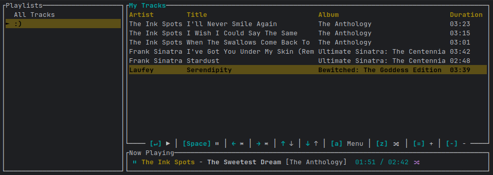 A very simple and no-nonsense music player, tm-player has the basic functionalities one could ask for. With a focus in terminal usage, it uses the Ratatui framework to provide a simply interface.
